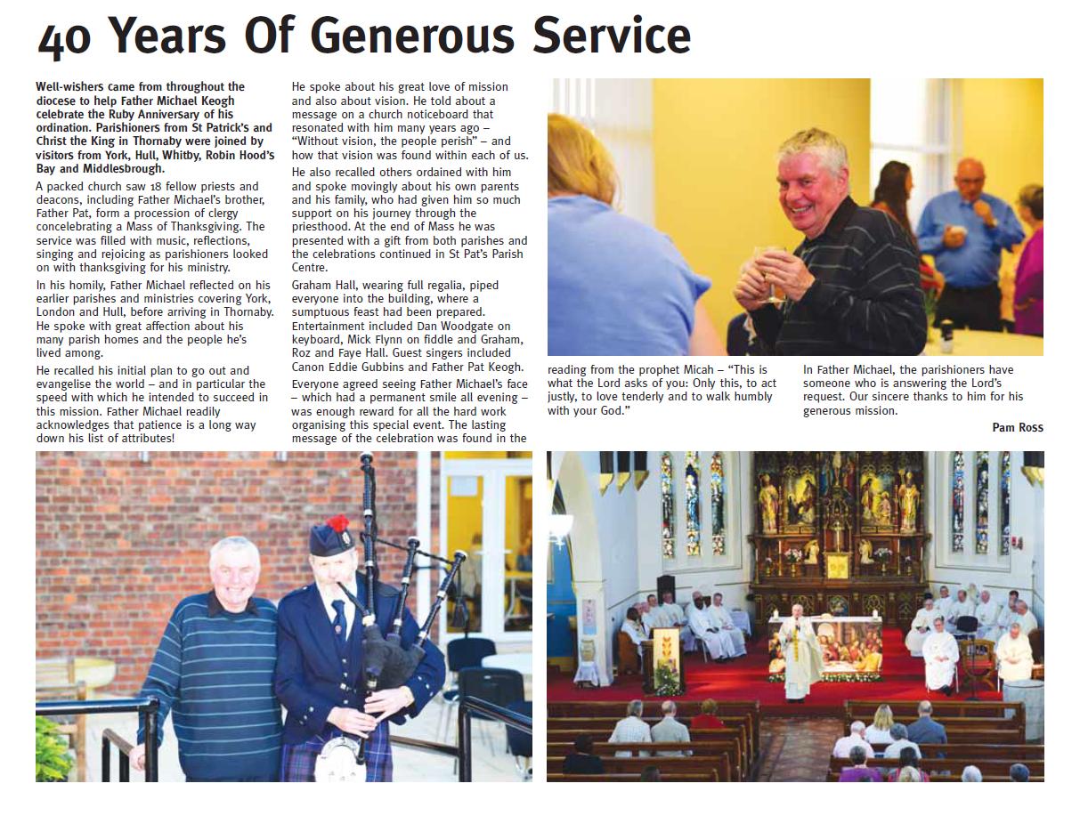 He was Parish Priest of Christ the King and St Patrick, Thornaby when he celebrated his 40th Jubilee in June 2015